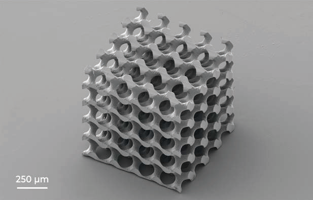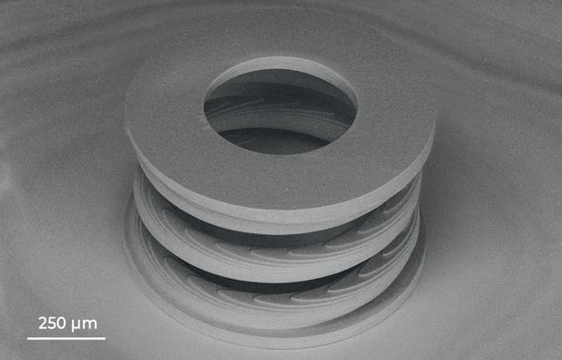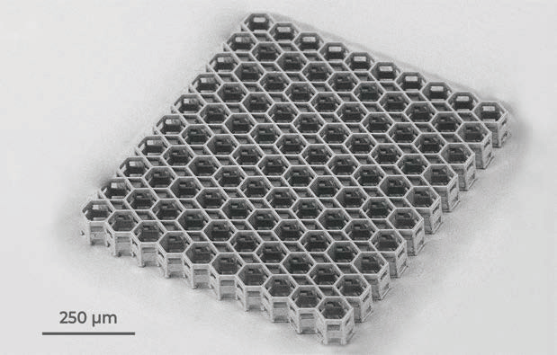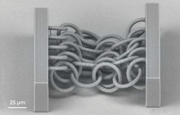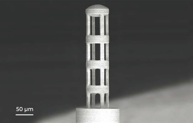? ? ? 多光子聚合 (MPP) 是一種適合于超材料制備的技術(shù)。超材料是一種復(fù)合材料,其物理特性與所用材料的物理性能不同。? ? ? 三維螺旋結(jié)構(gòu)在機(jī)械上是剛性的,但很輕。該結(jié)構(gòu)是通過使用加寬物鏡工作距離 (WOW) 方法制造的,利用該方法可以增加高數(shù)值孔徑物鏡的工作距離。該結(jié)構(gòu)的總體尺寸-為1mmx1mmx1mm。結(jié)構(gòu)高度遠(yuǎn)大于所用物鏡的工作距離(0.19 mm)。? ? ? 這種微制造技術(shù)使制造中尺度結(jié)構(gòu)成為可能,這些結(jié)構(gòu)的總尺寸比其最基本特征大幾個數(shù)量級,